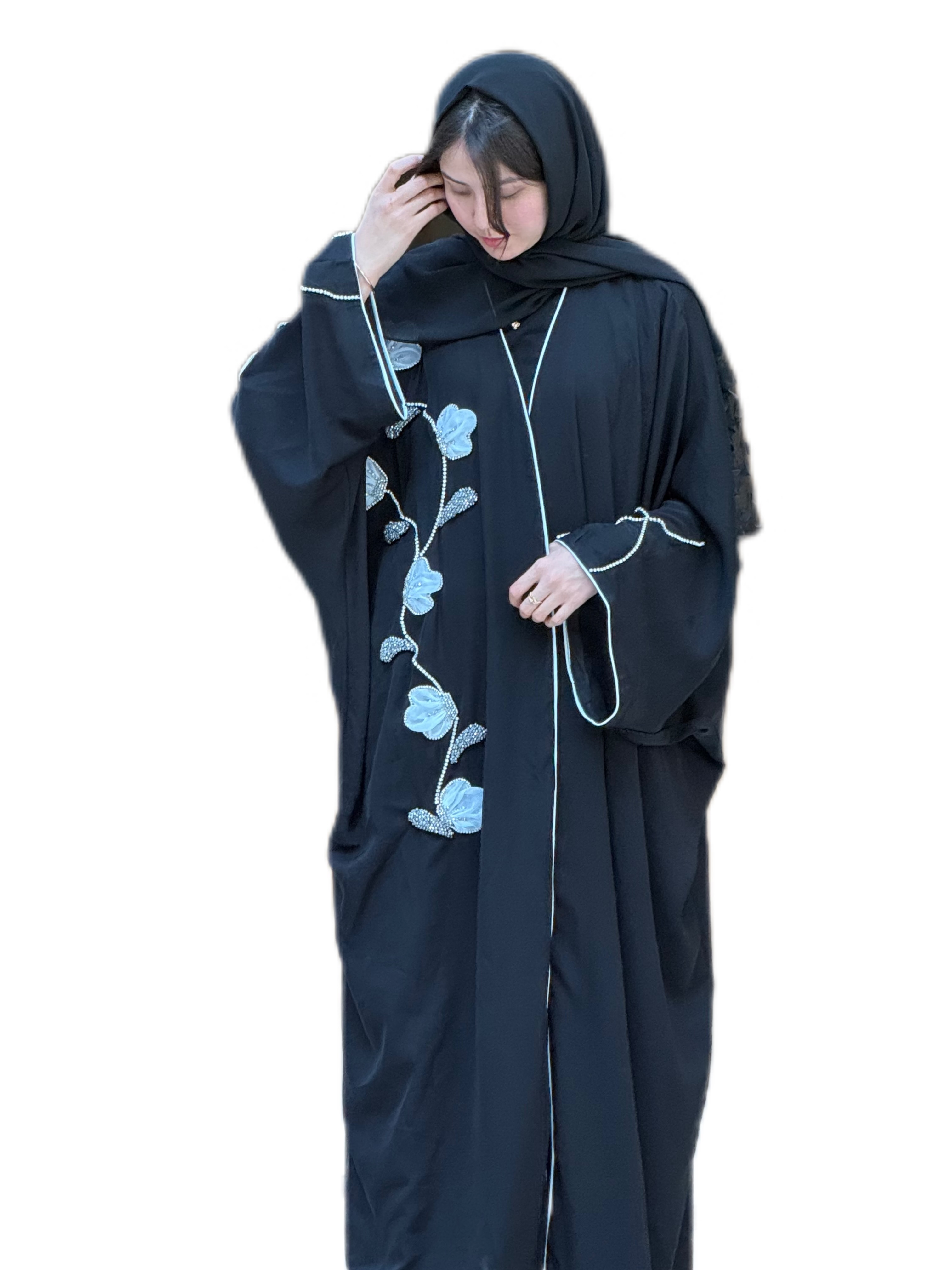 عبا " بهار " جنس کرپ ندا کره جواهر دوزی با متریال با کیفیت جواهردوزی کاملا دست دوز قد و سایز قابل تغییر